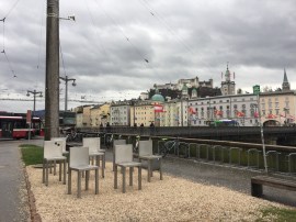 This is an art installation by performance and video artist Maria Abramovic called “Spirit of Mozart.” There are 8 stainless steel movable chairs and one stationary 14 meter tall stainless steel chair (seen to the right of the smaller chairs in the photo on the right). Passers by are encouraged to use the chairs, moving them around as desired. They are an invitation to sit quietly and contemplate in a place in town that is pulsating with activity. “In the heart of Salzburg, bustling with activity, I wanted to create a place of contemplation and dedicate it to the spirit of Mozart. The spirit is something invisible, but if you erect a seat for it, the invisible becomes visible. Anyone who sits and thinks long enough will be able to enter into a connection with invisible forces.” (Or gets really wet from sitting in the rain for too long!)