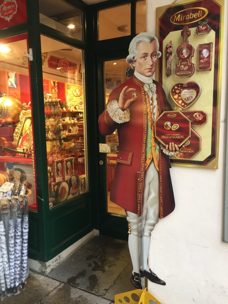 Mozart standing in front of one of the candy shops.