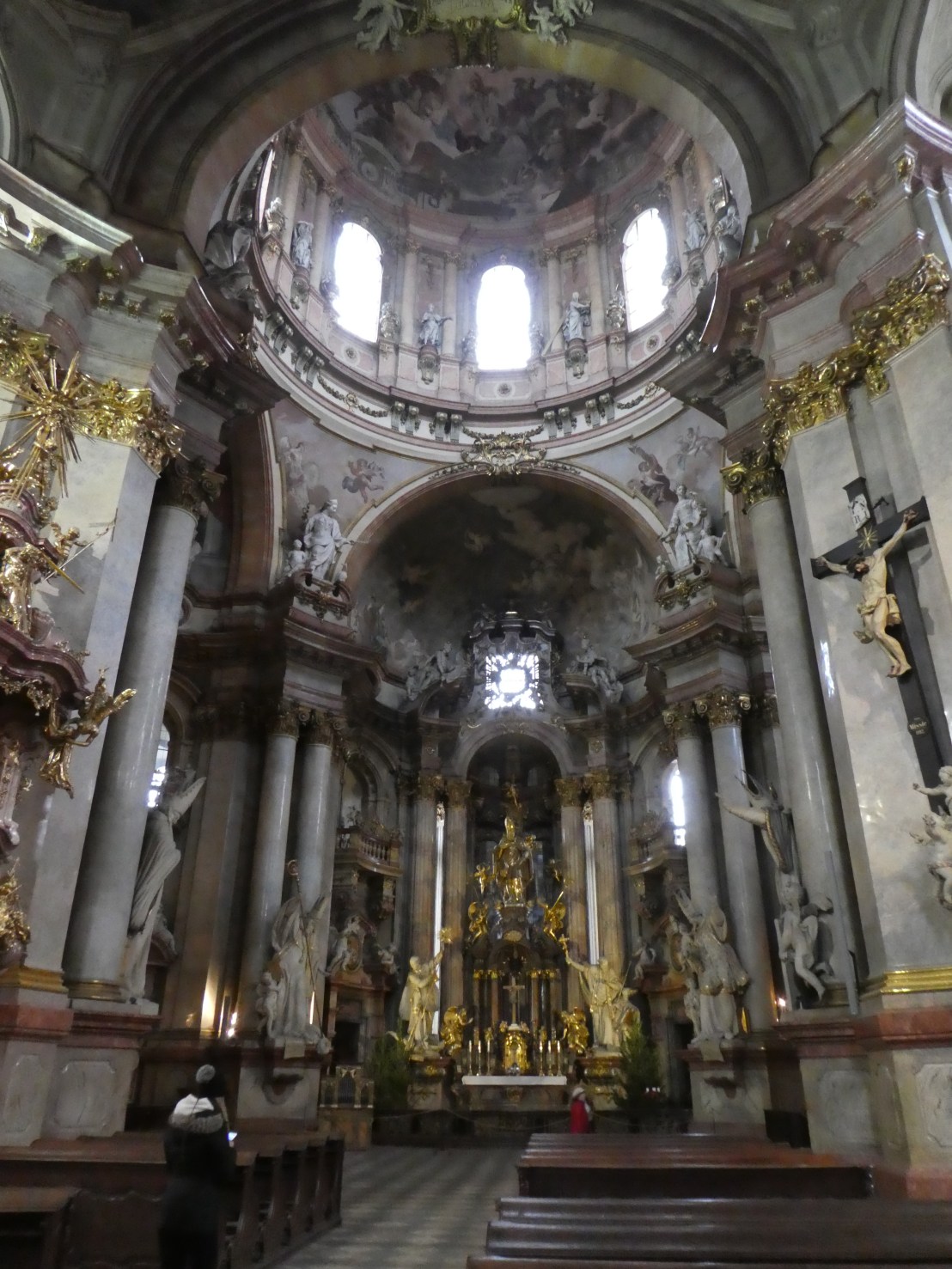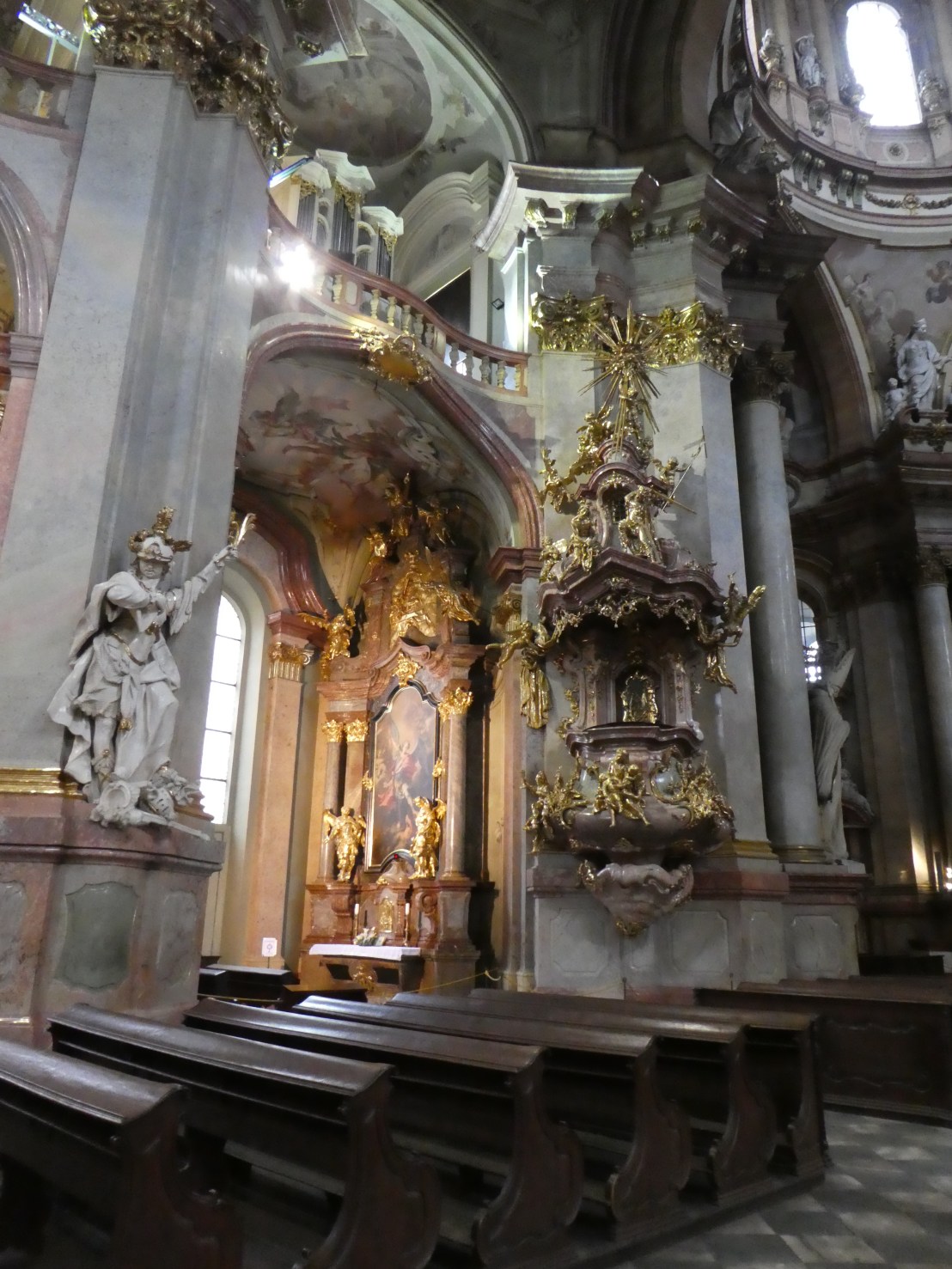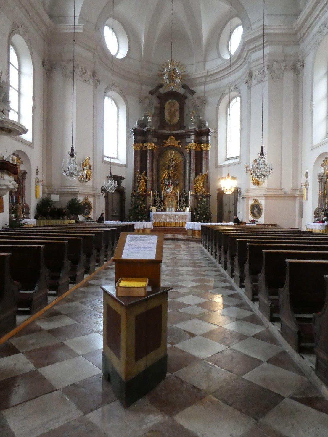 The inside of the mostly Baroque St. Sebastian Church. The high altar is adorned by a wonderful Madonna with Child from the year 1611.