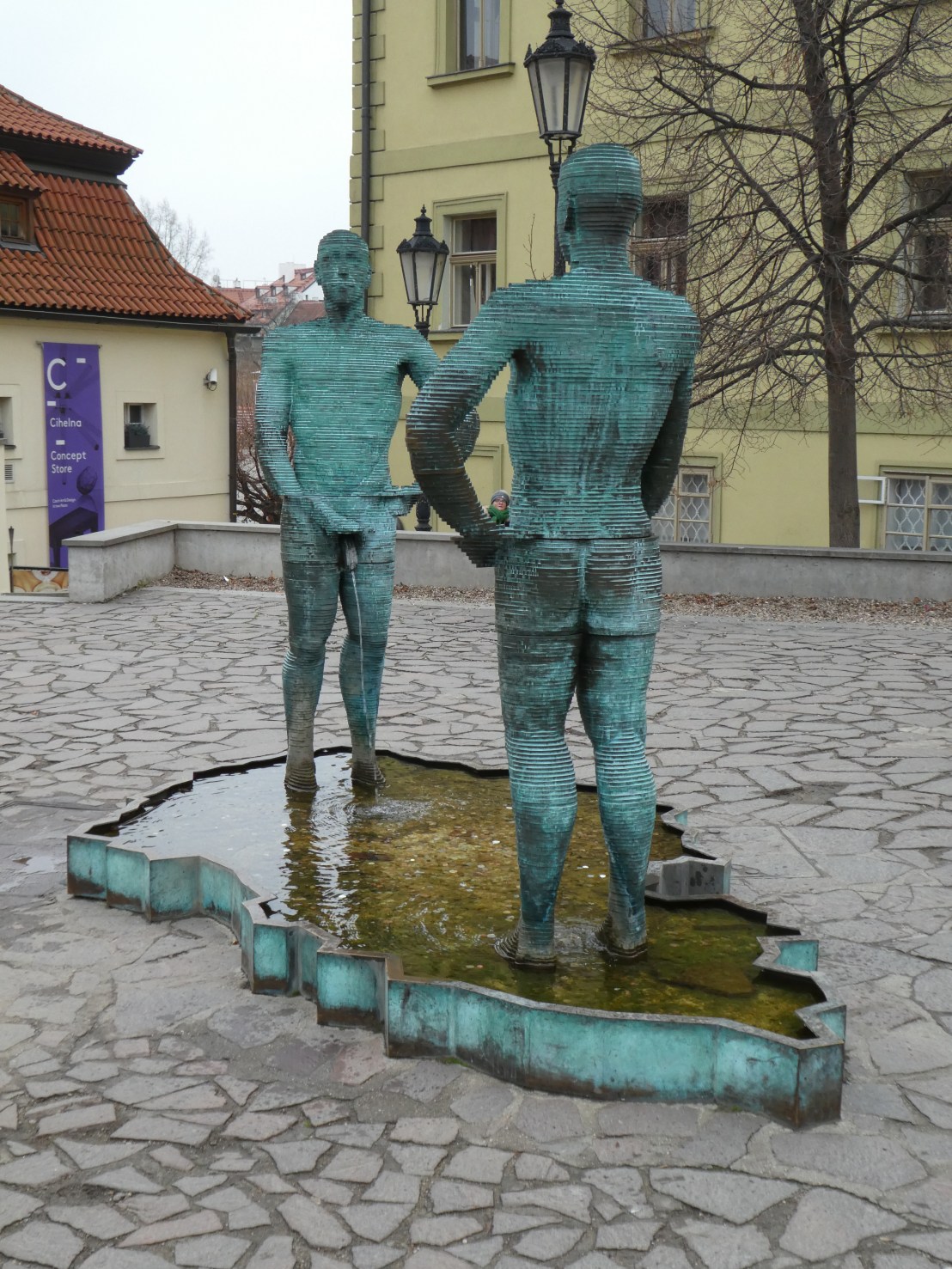 I saved the best photo for last. Only as a service to Pam, I’ve made it a point to look for some of the sculptures by David Cerny, the Czech Republic’s most original contemporary artist. We’re still looking for his babies crawling up the TV tower and we’ll have to continue that search when we come back next week. And there are lots of other we would like to see but unfortunately they’re not all in one location. However we were able to find his sculpture called “Piss” ouside of the Franz Kafka Museum which turned out to be near our hotel. Just as a point of information, the men’s middle sections rotate to the left and then back to the right, etc.  And they are standing in a shallow pool the shape of the Czech Republic. And I’ve read somewhere that you can send a text and one of the men will spell out your message in the water, although we didn’t see that happen and never did figure out exactly how that might work.