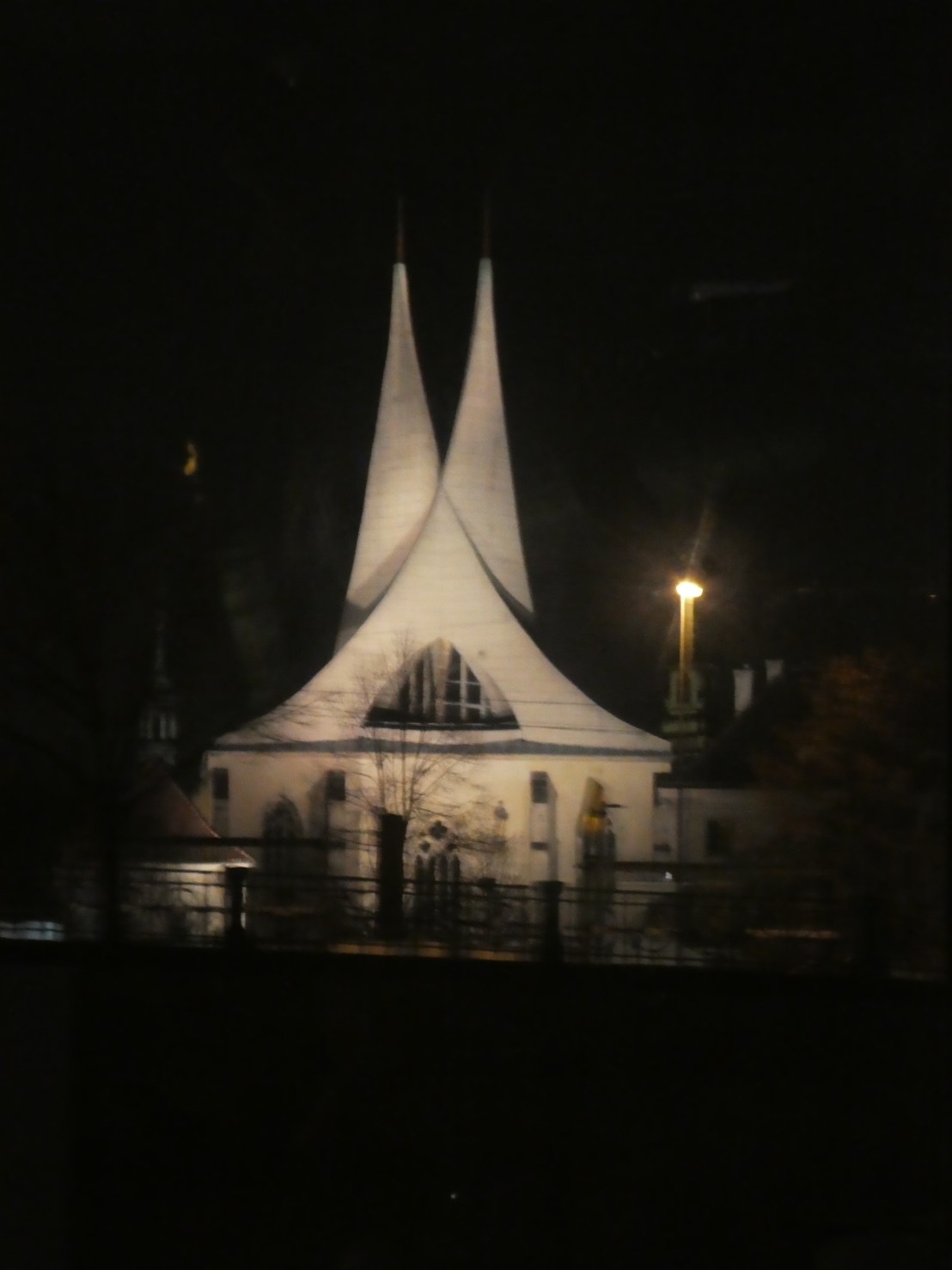 We assume this building with the rabbit ears is some kind of a church. We’d like to get to see this building in the daylight too.