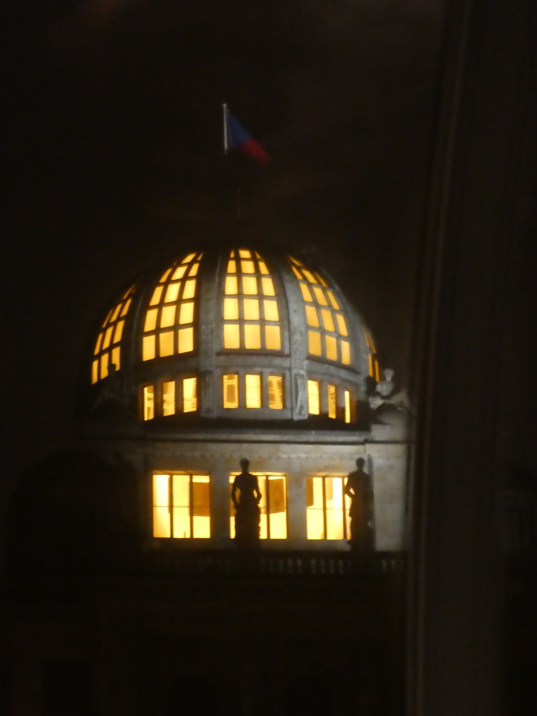 We took a dinner cruise on the Vltava River in a glass-domed boat simply because we had taken one in Budapest when we were there a couple of years ago and the lighted buildings reflected on the river were gorgeous. Prague’s waterfront is not quite as impressive at night and it turned out to be even more difficult to photograph. First of all, it rained during most of the trip and rain on a glass domed roof does not make for great photos. And it’s dark out, and the boat is moving. So between both of us, we managed to get a whopping 3 photos! And we didn’t even think to get a photo of the boat. Then at one point during the cruise, the boat hit a rock wall on one side and we realized we were also only a couple of feet from the opposite wall. And then we sat there for quite some time. We thought we were stranded! Then the walls next to the boat started to get shorter and we discovered that without our realizing it, we had gotten into river locks and once the water reached a certain height, we moved on again. We didn’t know there were locks in this area. Now we need to check out that area in the daylight and see what’s up with that.