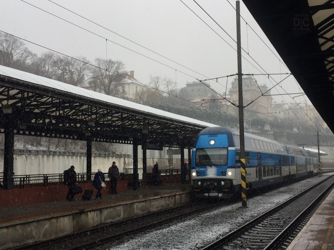 Today we took the train to Salzburg.  We’ll be in Salzburg for a week and then we’ll go back to Prague for a few days.  We left from the huge Prague Train Station and switched trains in Linz.  The entire travel time was 5 1/2 hours.  The trains are beautiful in Europe,  well maintained,  very crowded and very fast.   As we left our hotel for the train station, it began to snow.  You know, those great big floaty snowflakes that Chuck’s been pining for.  And it snowed most of the way to the Austrian border.  Places in Austria had snow already but the day was mostly sunny by the time we got that far.  But it was beautiful in the Czech Republic while it lasted.