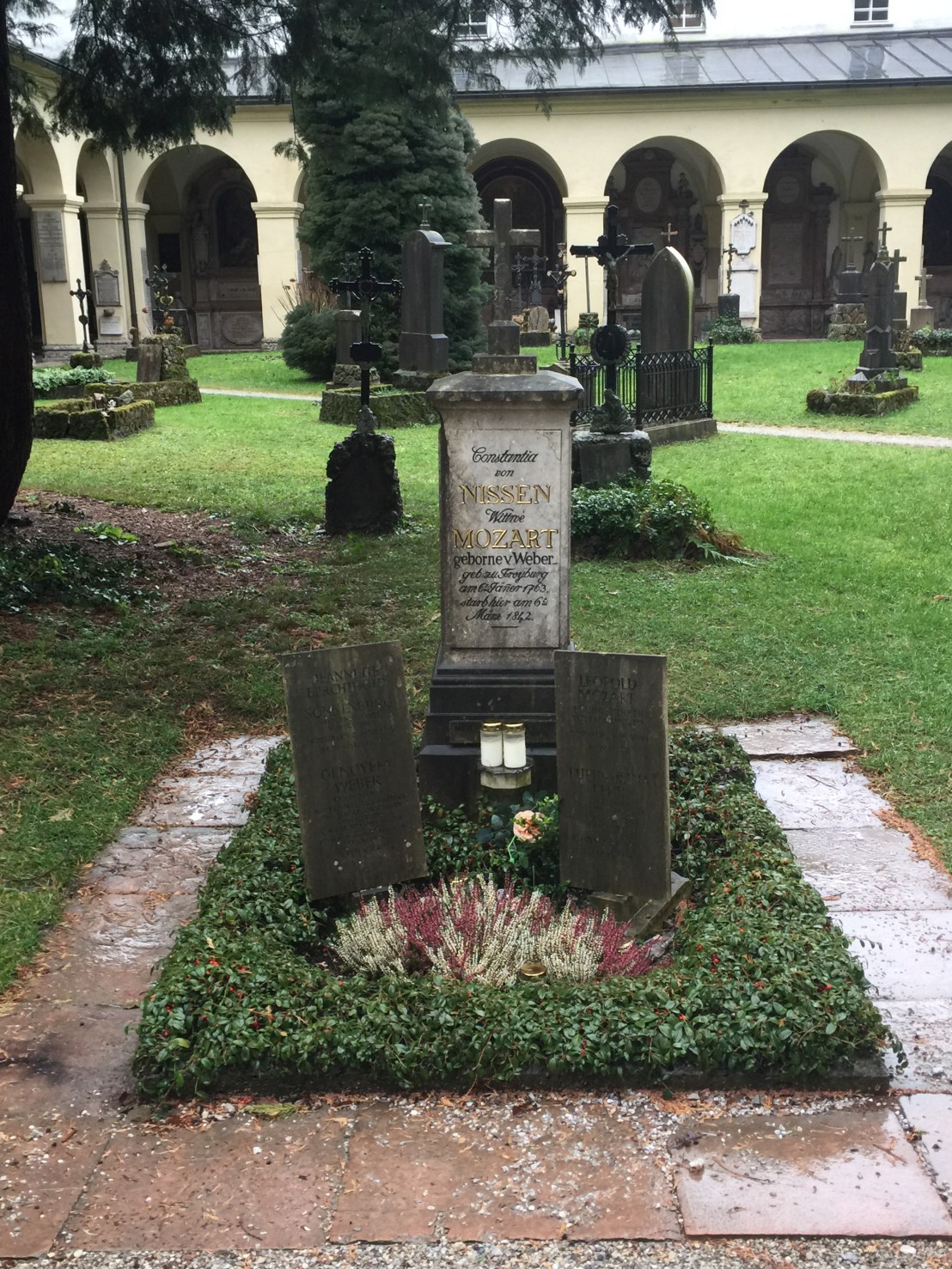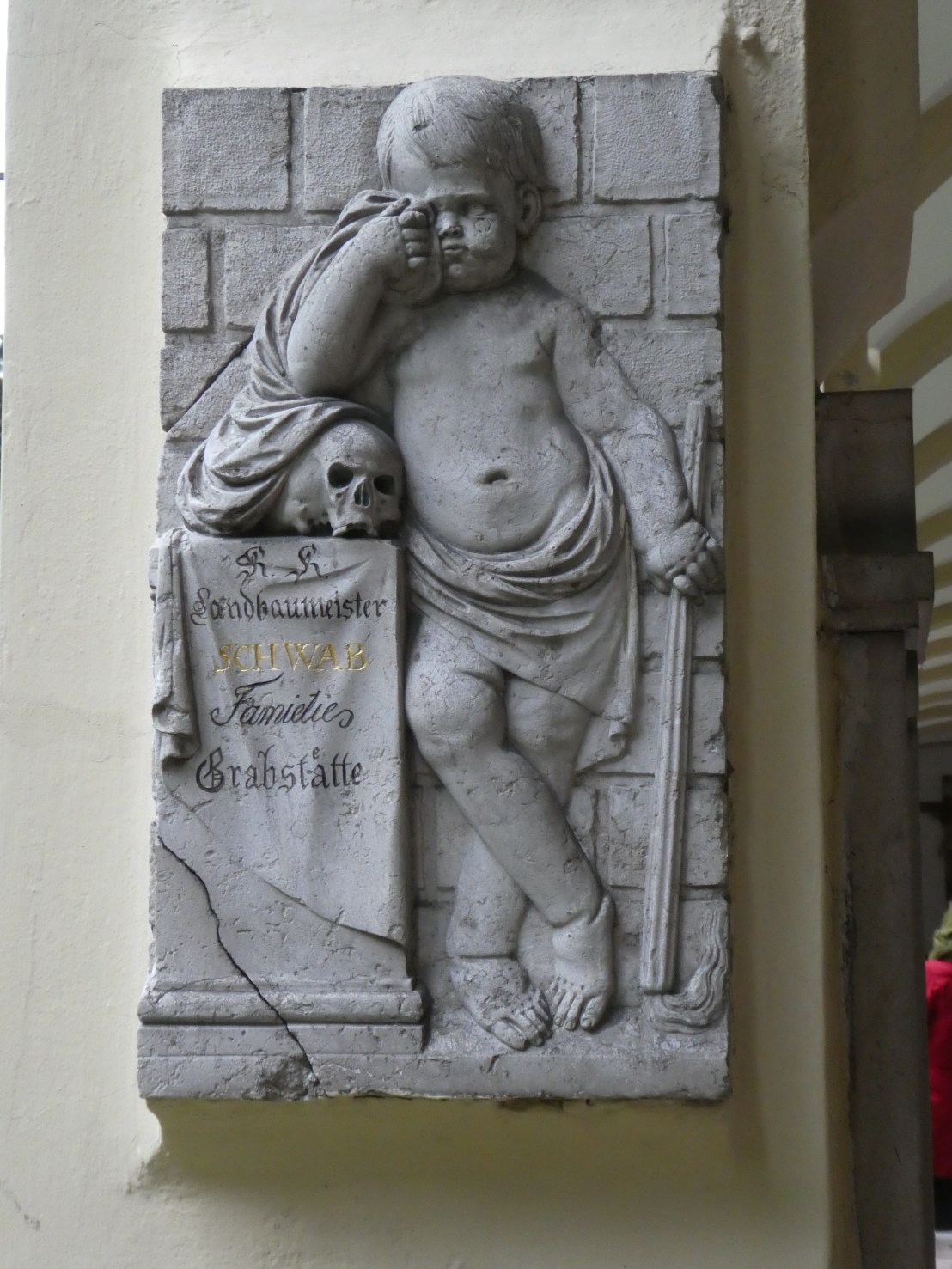 We stepped in out of the rain for an interesting visit to St. Sebastian’s Church and Cemetery which turned out to be very close to our hotel. The mostly Baroque church was rebuilt in the early 1800’s after a fire destroyed its interior.  It’s difficult to photograph as it’s tightly sandwiched between adjacent buildings. But behind the church are a fascinating cemetery and mausoleum.  The arcades lining the small cemetery include ornately designed tombs of some of Salzburg’s most notable residents. Prince Archbishop Wolf Dietrich von Raitenau, arguably Salzburg’s most important ruler, occupies the mausoleum and the cemetery is also the final resting place of several members of the Mozart family (but not Mozart himself who is buried in Vienna).