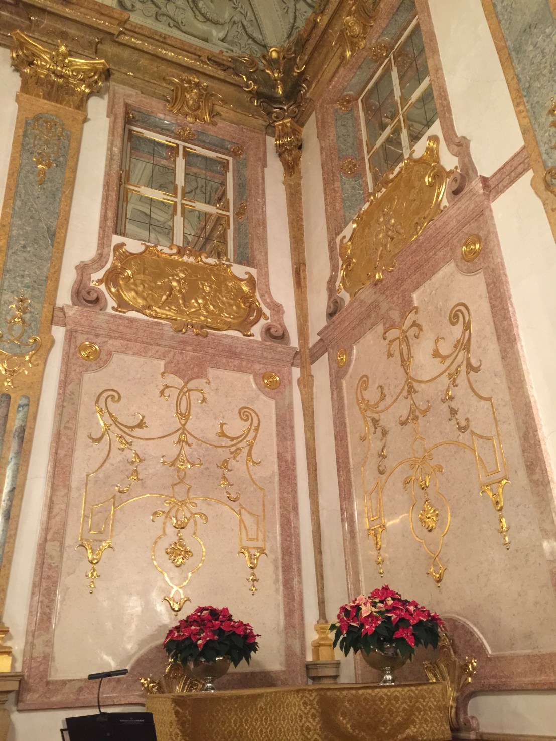 One of the beautiful walls in the Marble Hall in the Mirabell Palace where the music concert took place. The room is very tall so is difficult to photograph.
