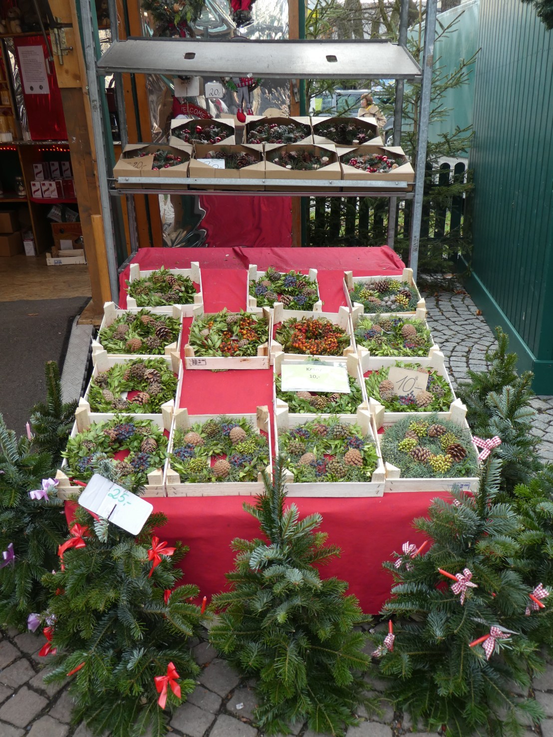 Live pine trees, especially these mini ones that fit in small apartments, are popular sellers at the markets as well as wreaths like these fragrant ones made of fresh local herbs, pine cones and berries.