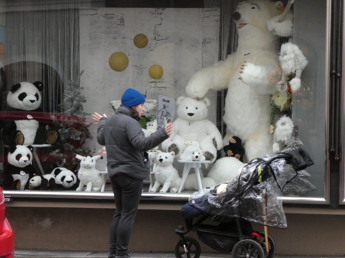I love this photo of a young mother in front of the Steiff Bear store explaining the stuffed animals to her baby.