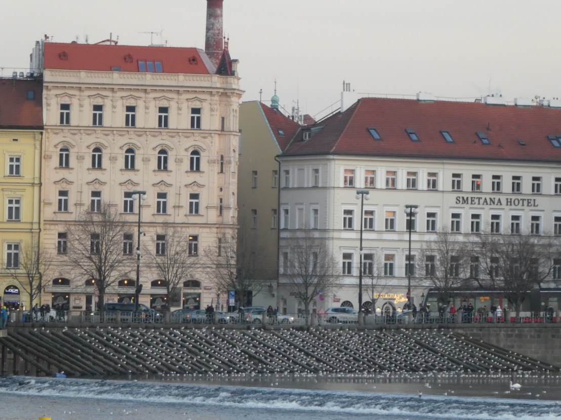 Another view directly across the river shows 2 beautiful old buildings fronted by even more seagulls in what appears to be stadium seating. I’ll need to see if I can get the story about why they’re there – – and so evenly spaced.