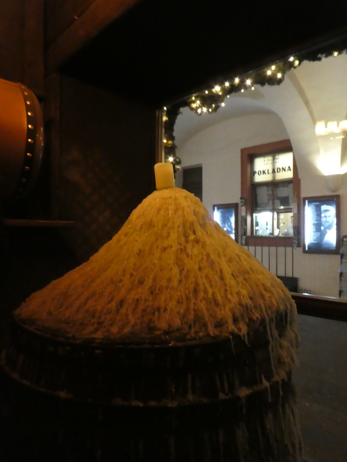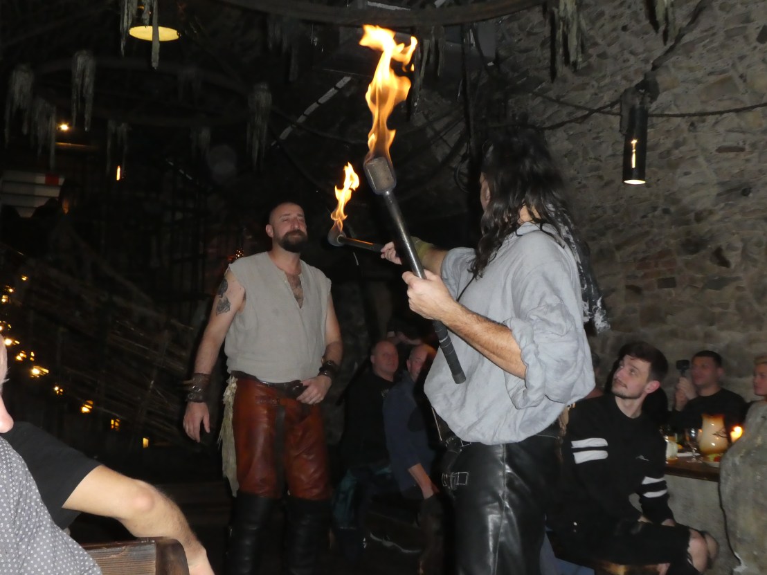 Last night was our Medieval Dinner.  Interesting.  Surprisingly good food (I don’t think I’ve ever had pig knuckles before!).  Fun entertainment, but not sure how “medieval” it was. Our guides met our group (about 20 people) at the end of the Charles Bridge. I’m not sure why we couldn’t just meet at the restaurant but it was sort of like a tour – in fact, everybody we saw in the restaurant was clearly a part of a tour.  We hiked vigorously together to the restaurant – – down alleys, up streets, across bridge, around corners – – for about 20 minutes.  Then we went down into this underground dungeon-like restaurant.  It was very dark inside, mostly candlelit, and there appeared to be many rooms down dark hallways in this cavernous restaurant.  Our room had about 8 picnic-style tables for 6-8 people each.  We shared a table with a couple from Liverpool, a couple from Barcelona, and a woman and her 20-something daughter originally from Brooklyn who had moved to Ireland a few years ago and bought a small farm.  It was a fun, international table.  The only strange thing was that after it was over, they didn’t take us back to our meeting point.  Since we had just arrived and were not yet familiar with the neighborhood, we certainly had an interesting time finding our way back to our hotel!